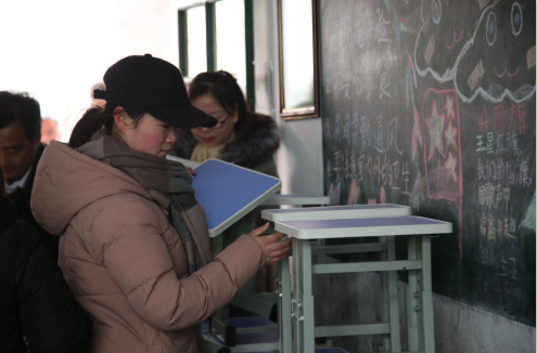 济南红绘医院业务院长韩作锋(左)代表医院向丁庄小学捐赠120套桌椅